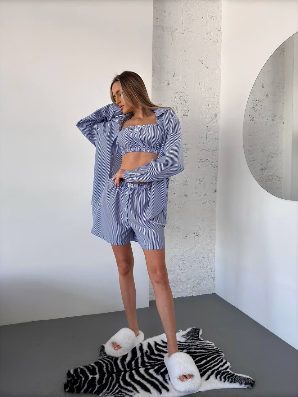 Домашній комплект трійка (шорти+сорочка+топ) у смужку синього кольору 31557