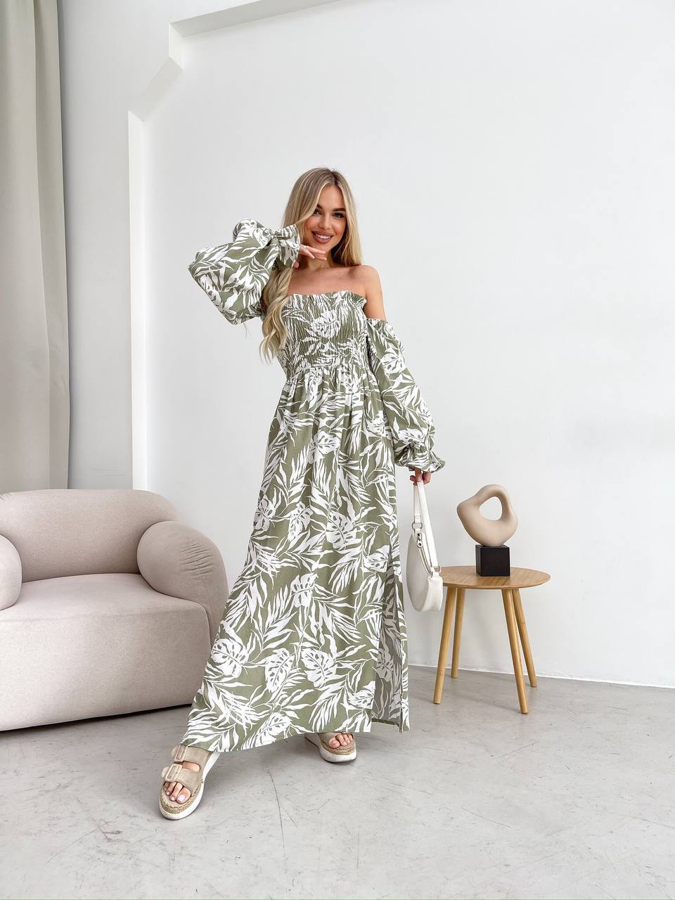 Довга лляна сукня фiсташкового кольору 32628