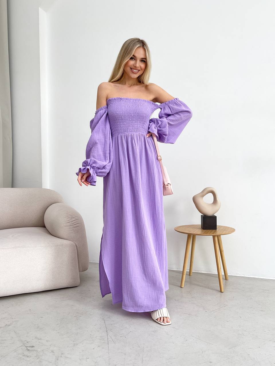 Довга муслінова сукня бузкового кольору 31984