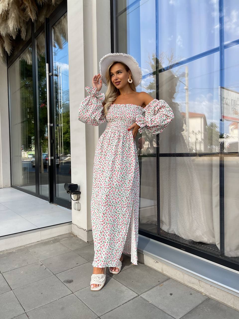 Довга муслінова сукня в квітку молочного кольору 31978