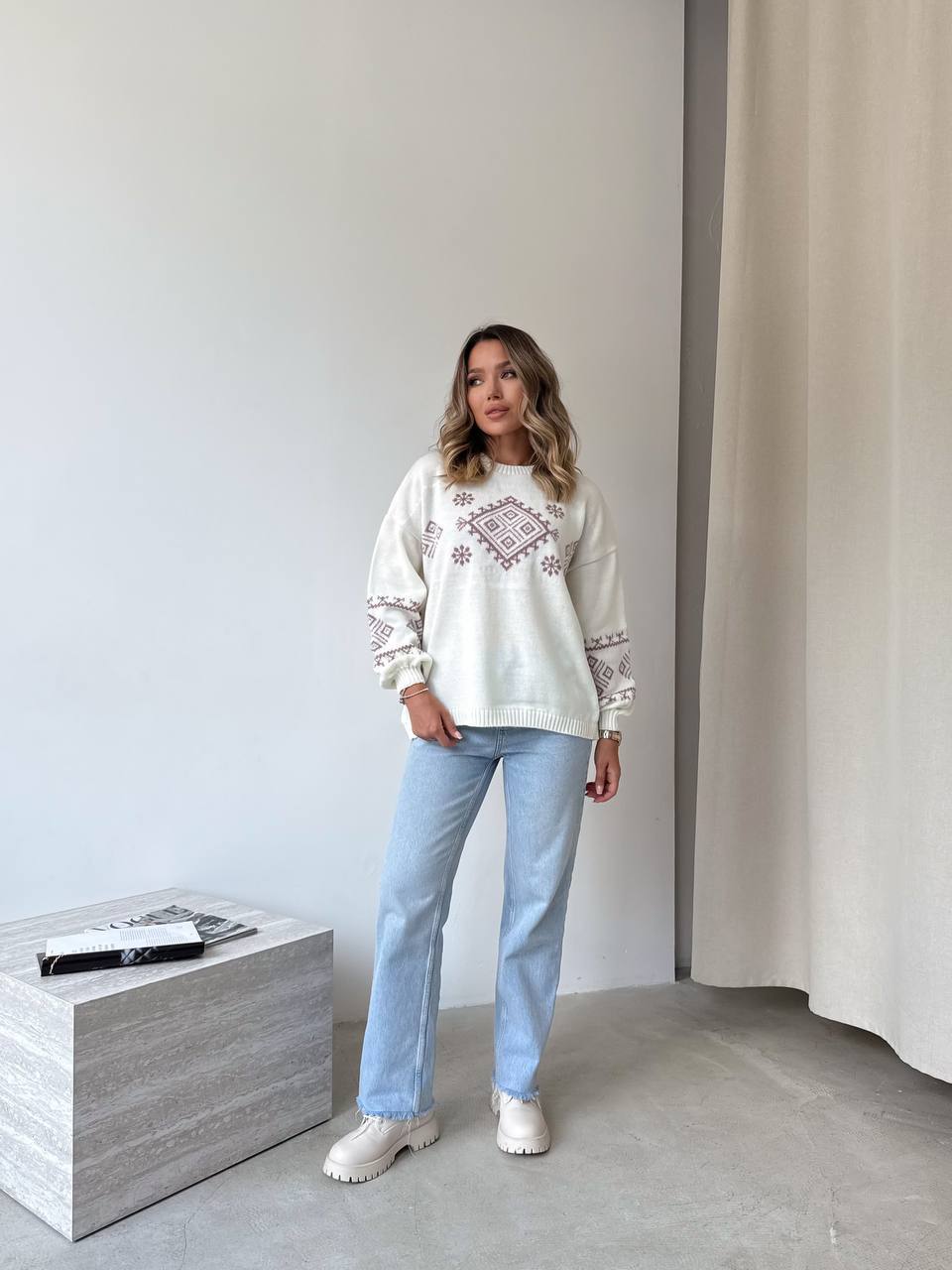 Класичний жіночий светр із етнічним візерунком молочного кольору 34182