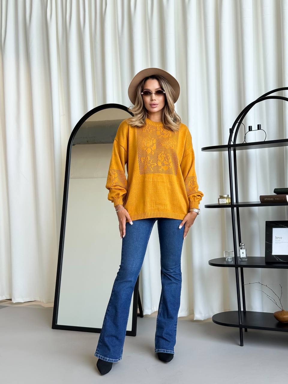 Класичний жіночий светр з ажурним плетiнням жовтого кольору 34179