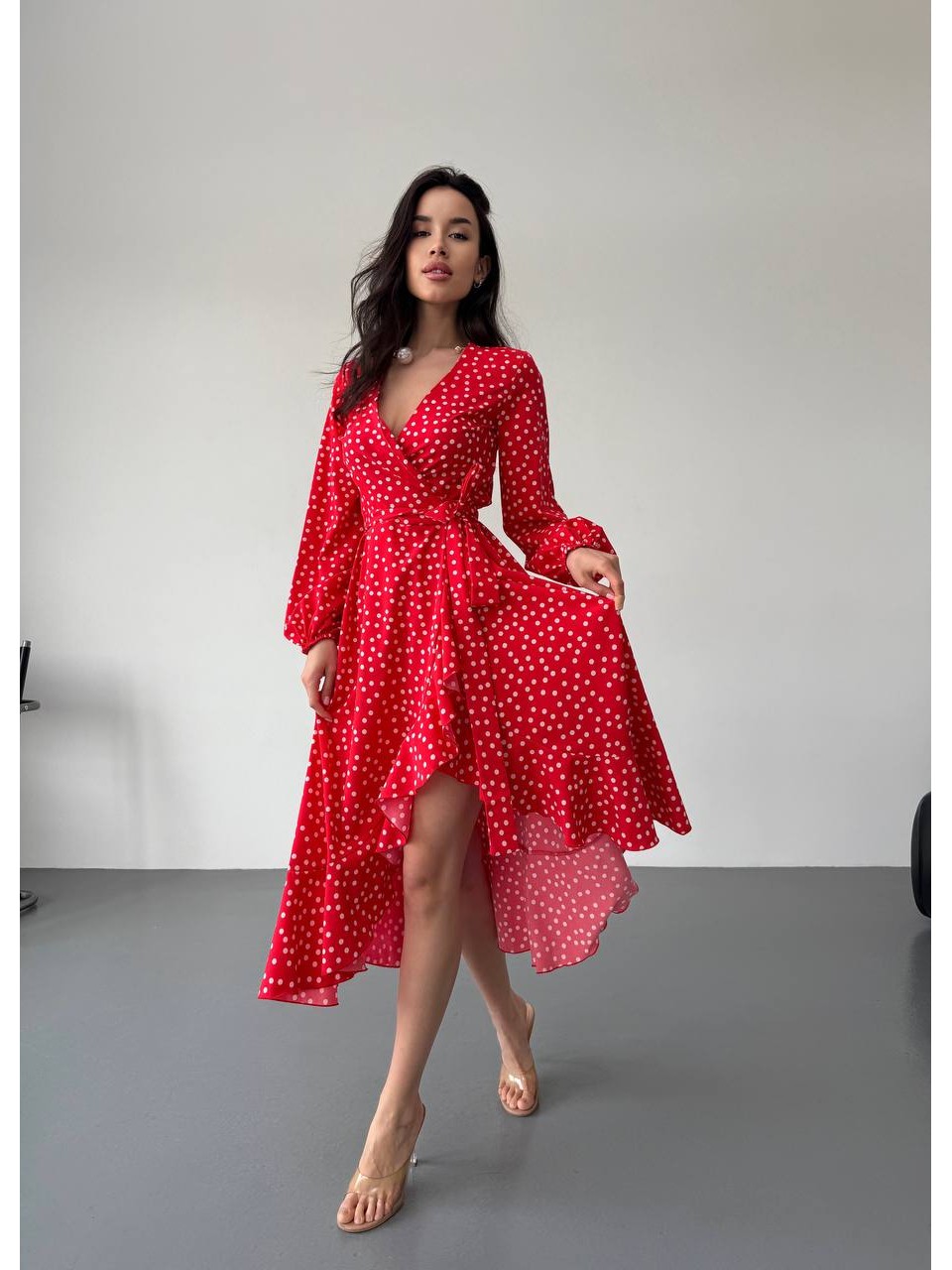 Легка сукня міді на запах у горох червоного кольору 32584