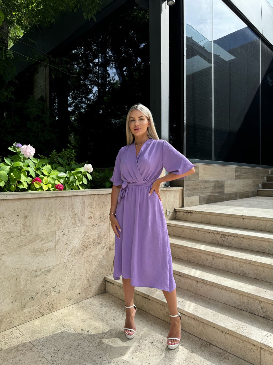 Легка сукня на запах із поясом лавандового кольору 32329