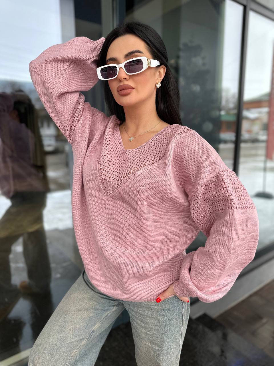 Легкий жіночий светр із вирізом пудрового кольору 31730