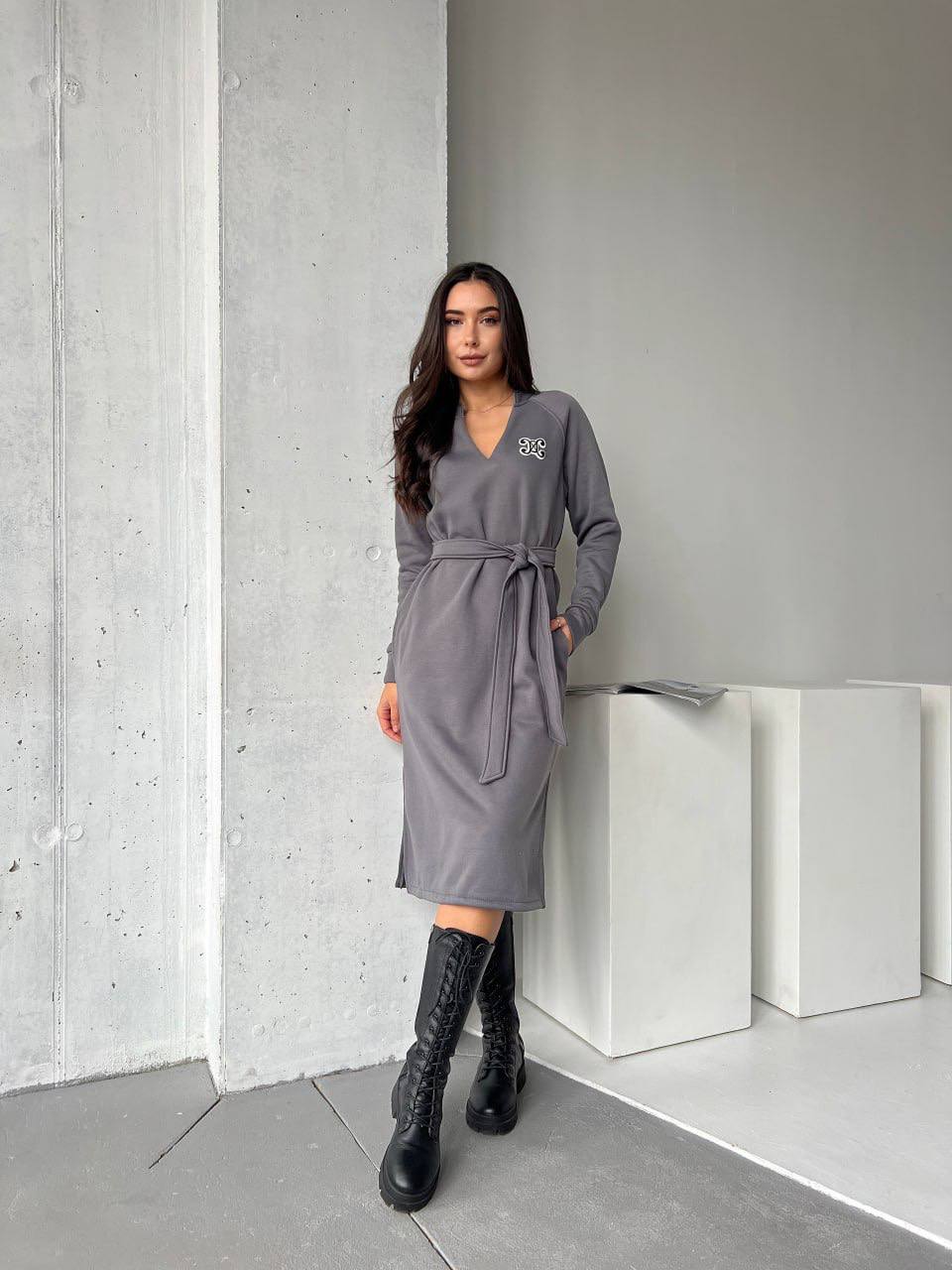 Сукня з поясом на флісі графітового кольору 29377