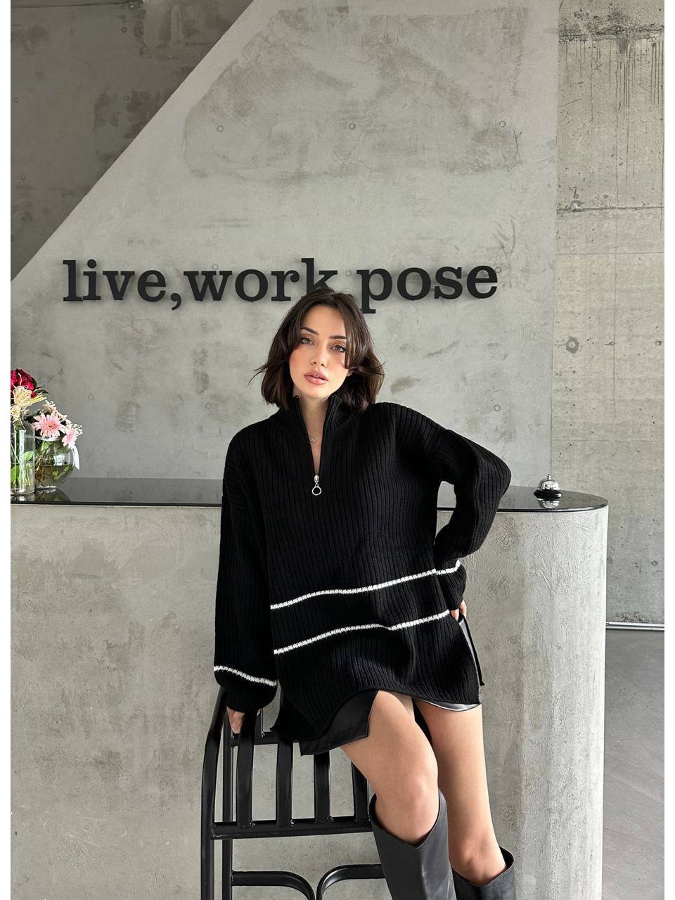 Подовжений жіночий светр на блискавці чорного кольору 30468