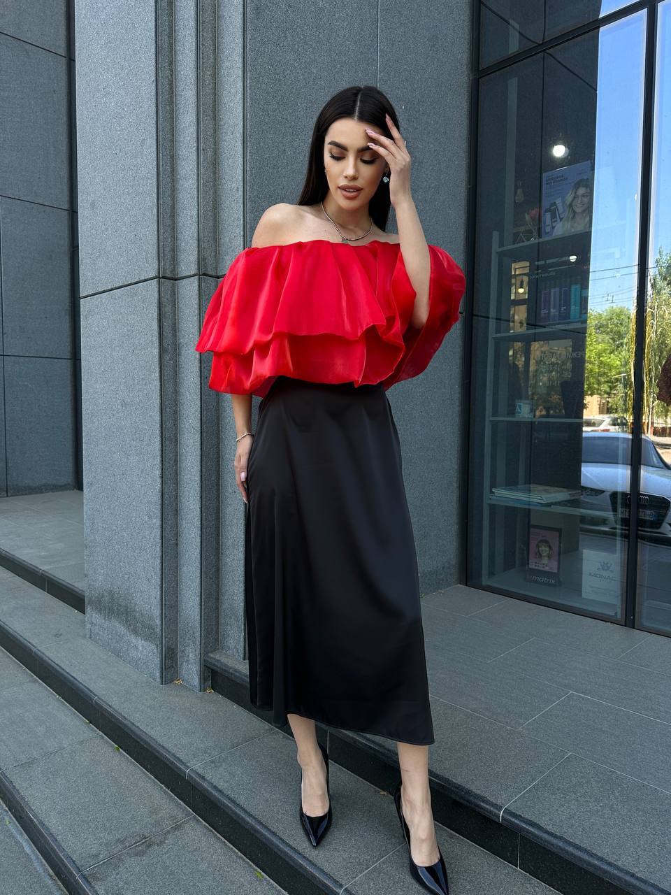 Повітряний жіночий топ із воланами червоного кольору 32504