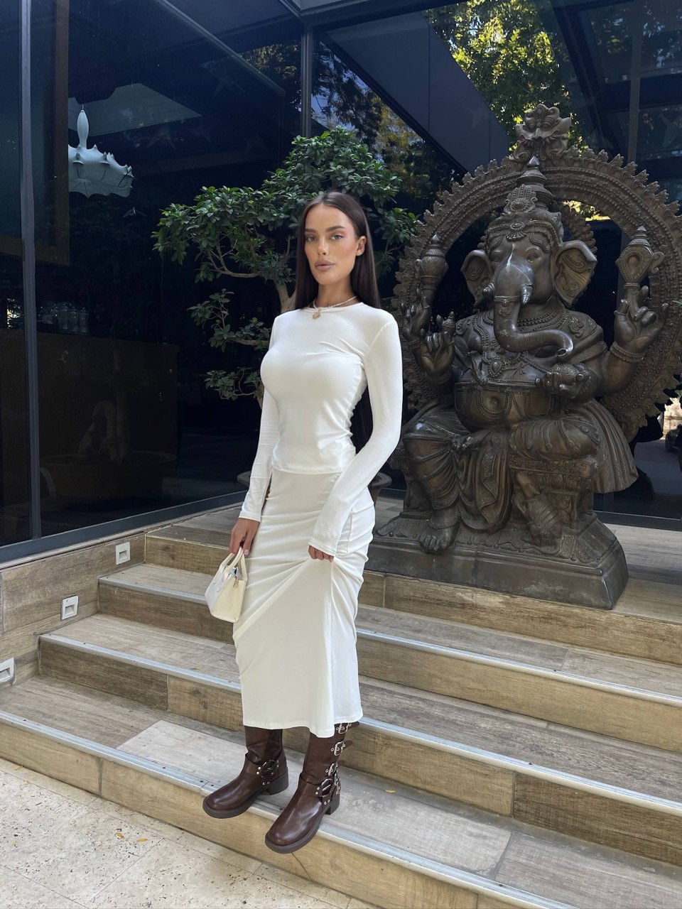 Прогулянковий жіночий костюм (спідниця+лонгслів) молочного кольору 34532