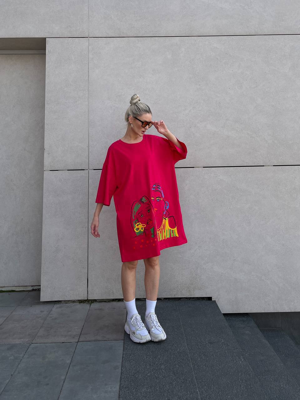 Хлопковое платье-футболка с рисунком красного цвета 32215