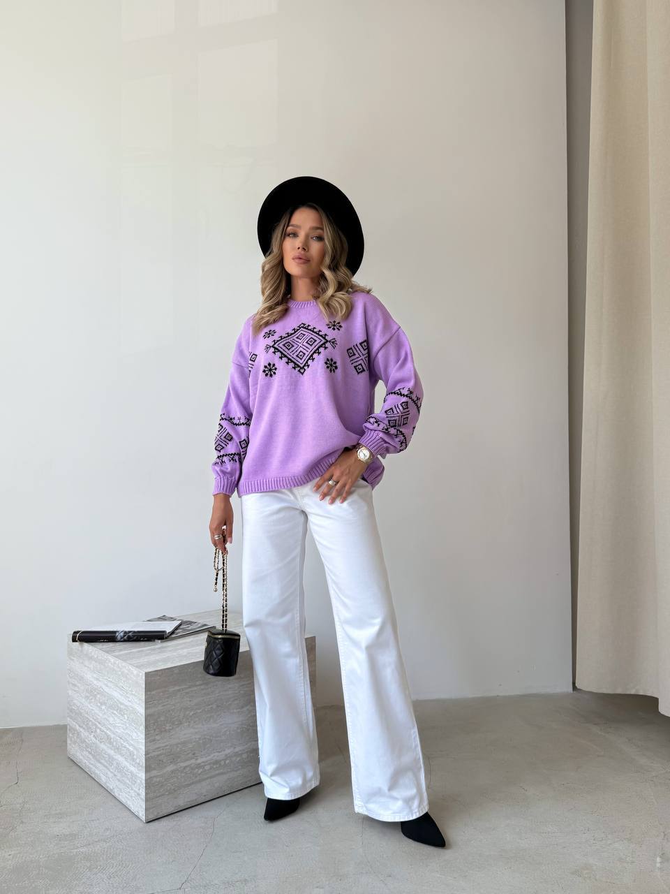 Женский классический свитер с этническим узором сиреневого цвета 34186