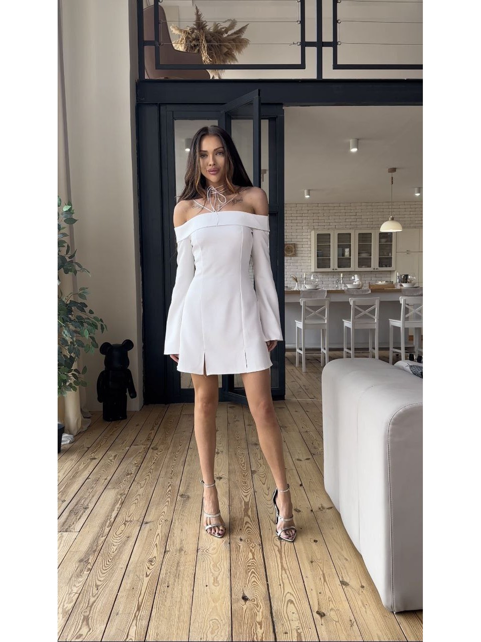 Классическое платье мини с открытыми плечами молочного цвета 31553