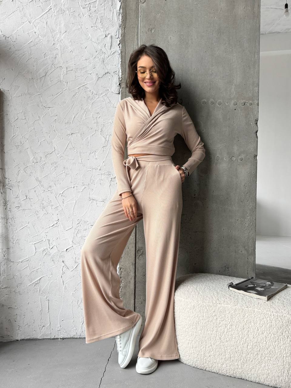 Прогулочный женский костюм в рубчик бежевого цвета 31111