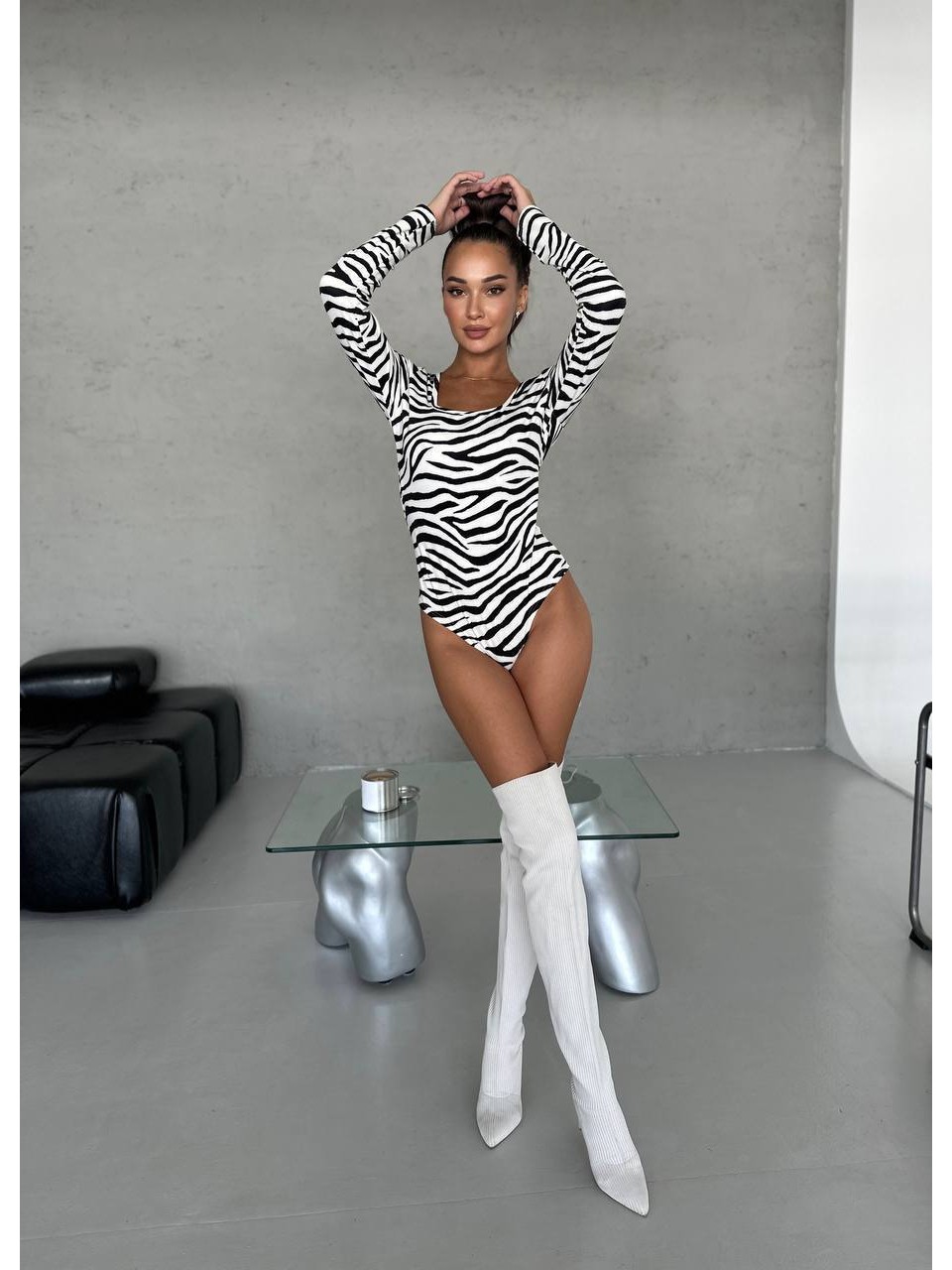 Стильный боди с рукавом на микро-флисе цвета зебры 28934