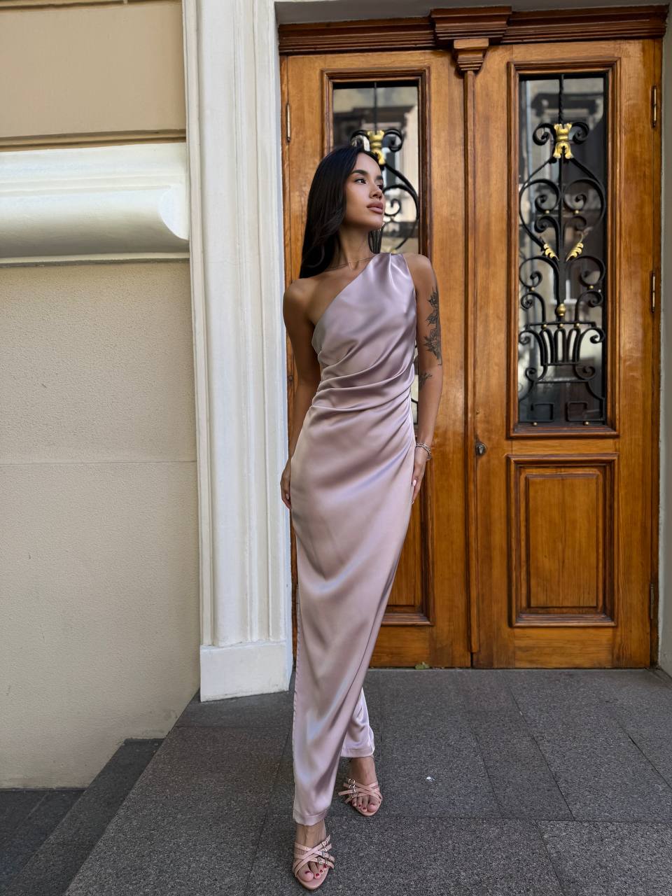 Вечернее шелковое платье макси пудрового цвета 34376