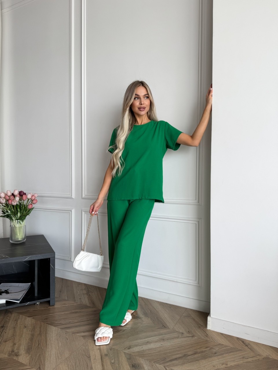 Женский легкий прогулочный костюм зеленого цвета 33391