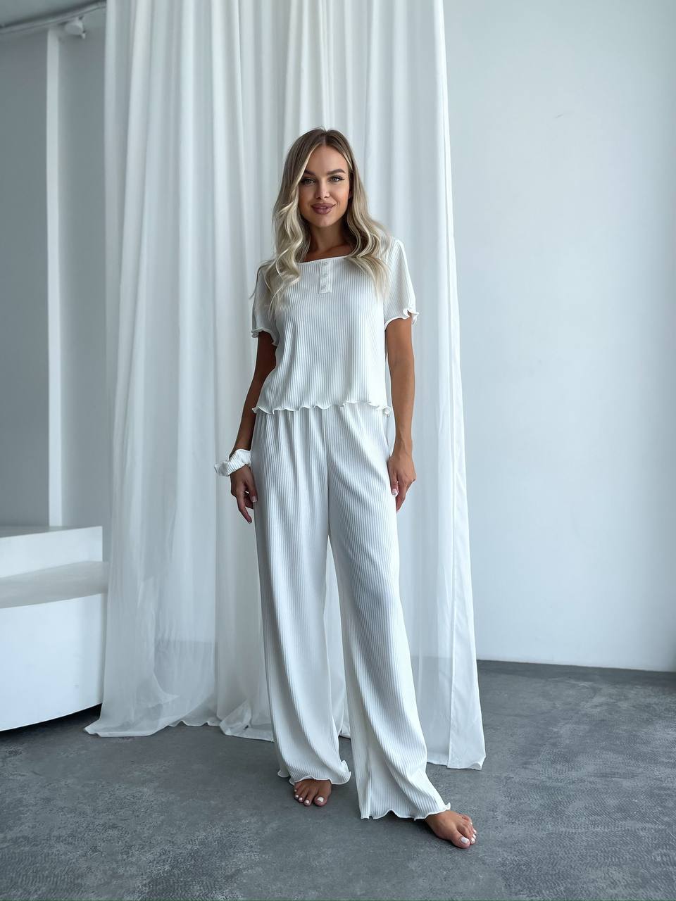 Женский домашний комплект тройка (топ+резинка+штаны) молочного цвета 34009