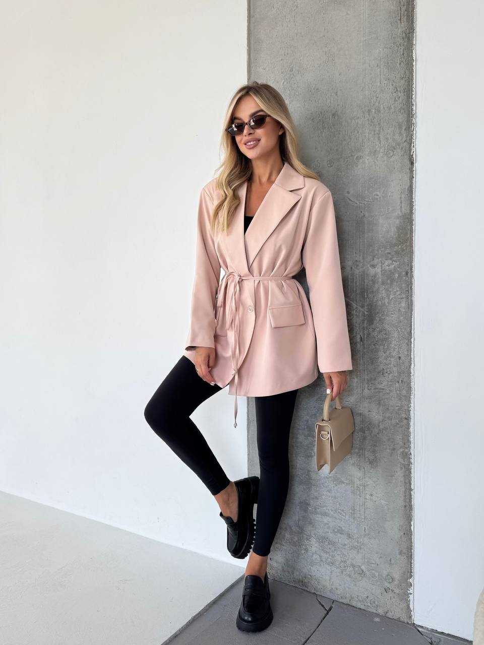 Женский удлиненный пиджак с поясом бежевого цвета 34125