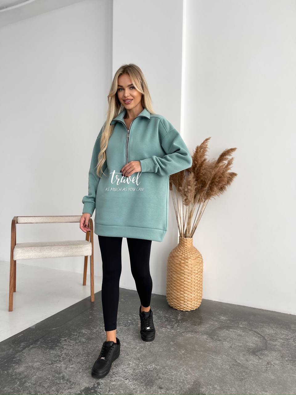 Женский удлиненный свитшот на флисе фисташкового цвета 35056