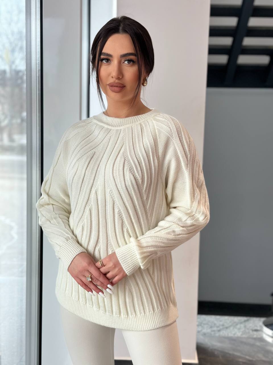 Женский свитер с фактурной вязкой молочного цвета 34354