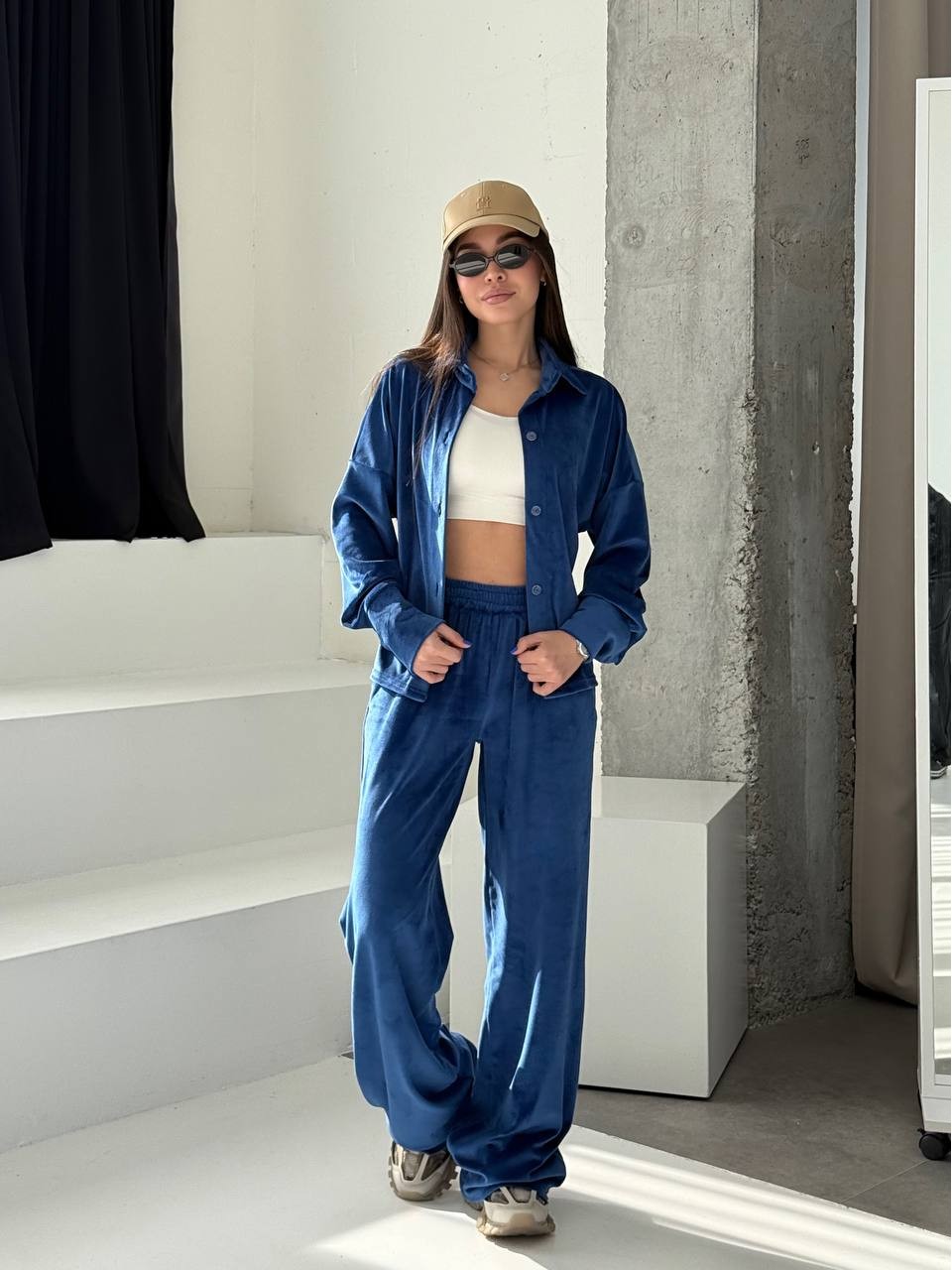 Женский велюровый костюм на пуговицах синего цвета 34662