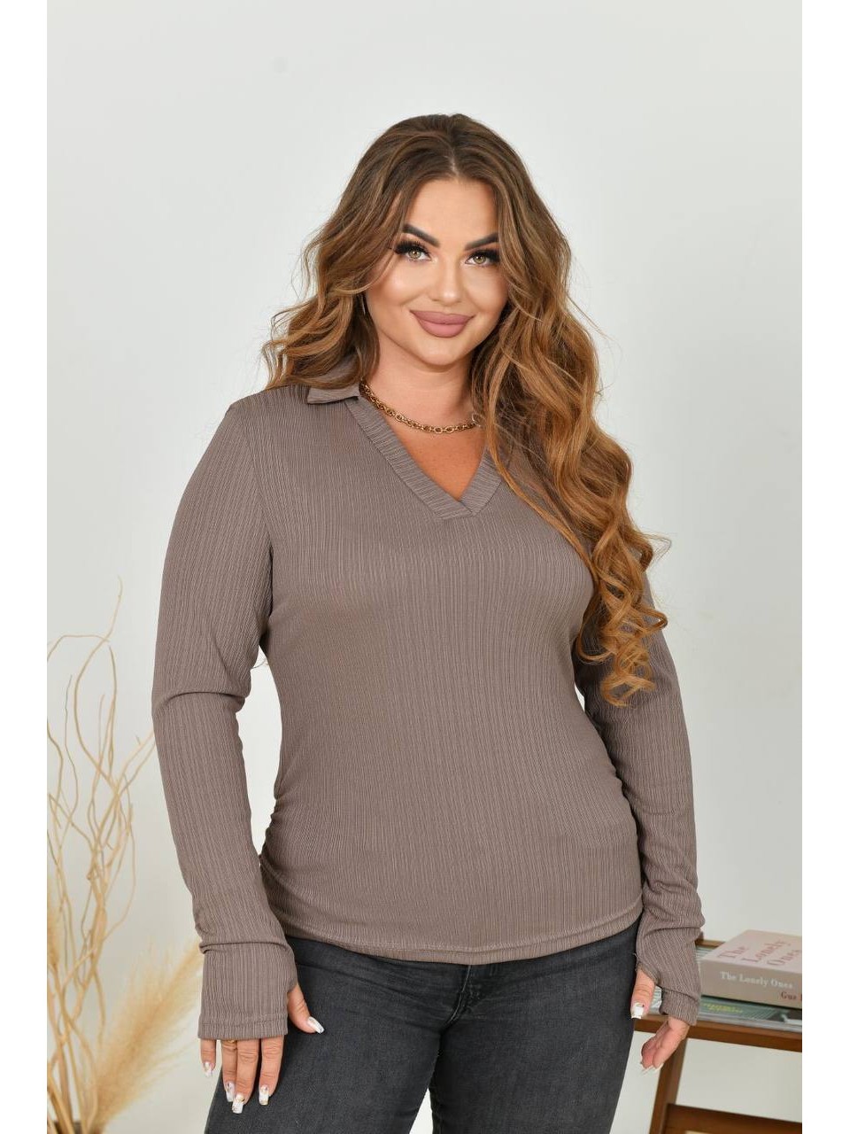 Женский лонгслив с воротником кофейного цвета 35227