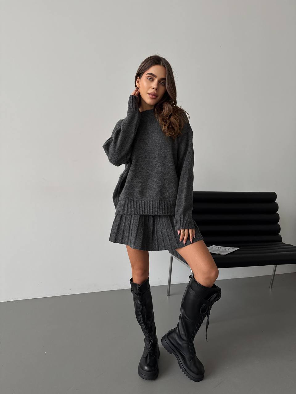 Женский теплый костюм 2-ка с юбкой графитового цвета 35269