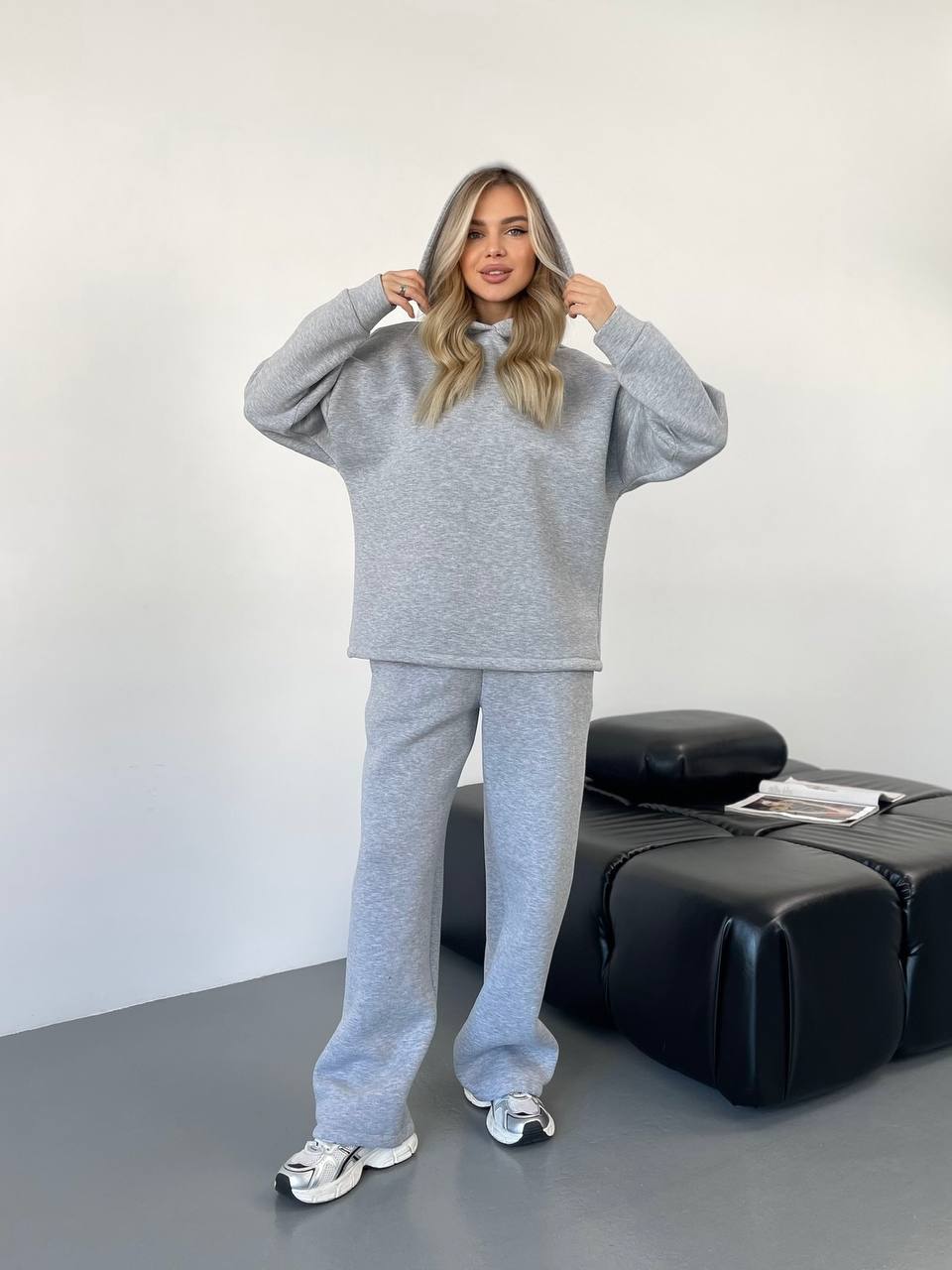 Теплий жiночий костюм з капюшоном сiрого кольору 35813