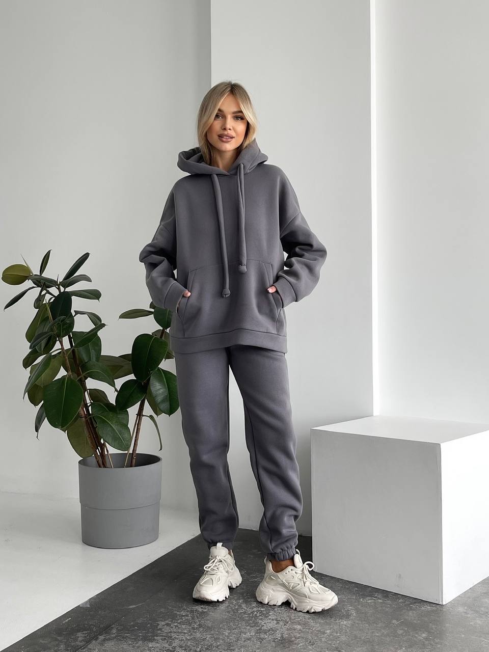 Теплий жіночий костюм з капюшоном графiтового кольору 29397