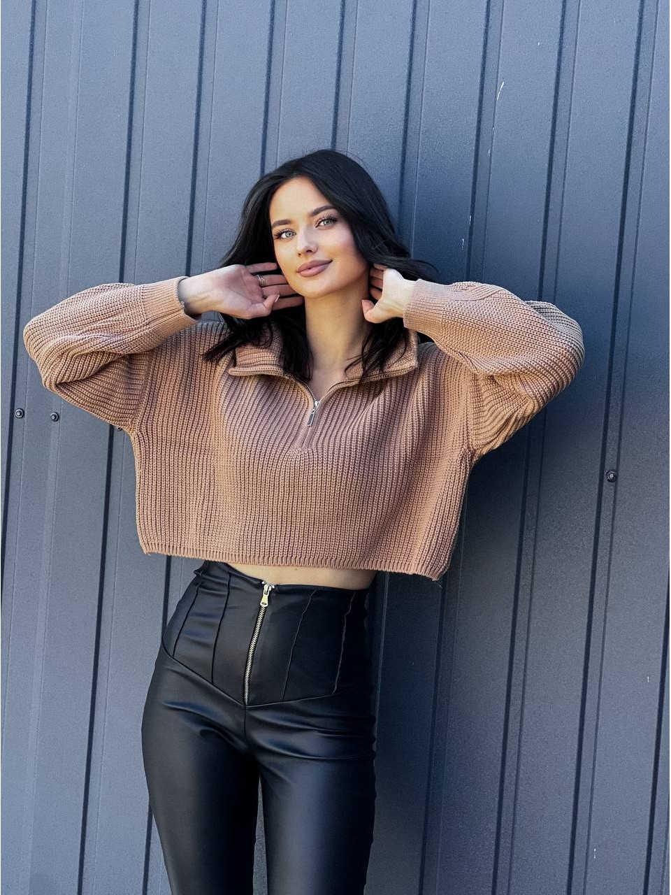 Укорочений жіночий светр на блискавці бежевого кольору 29285