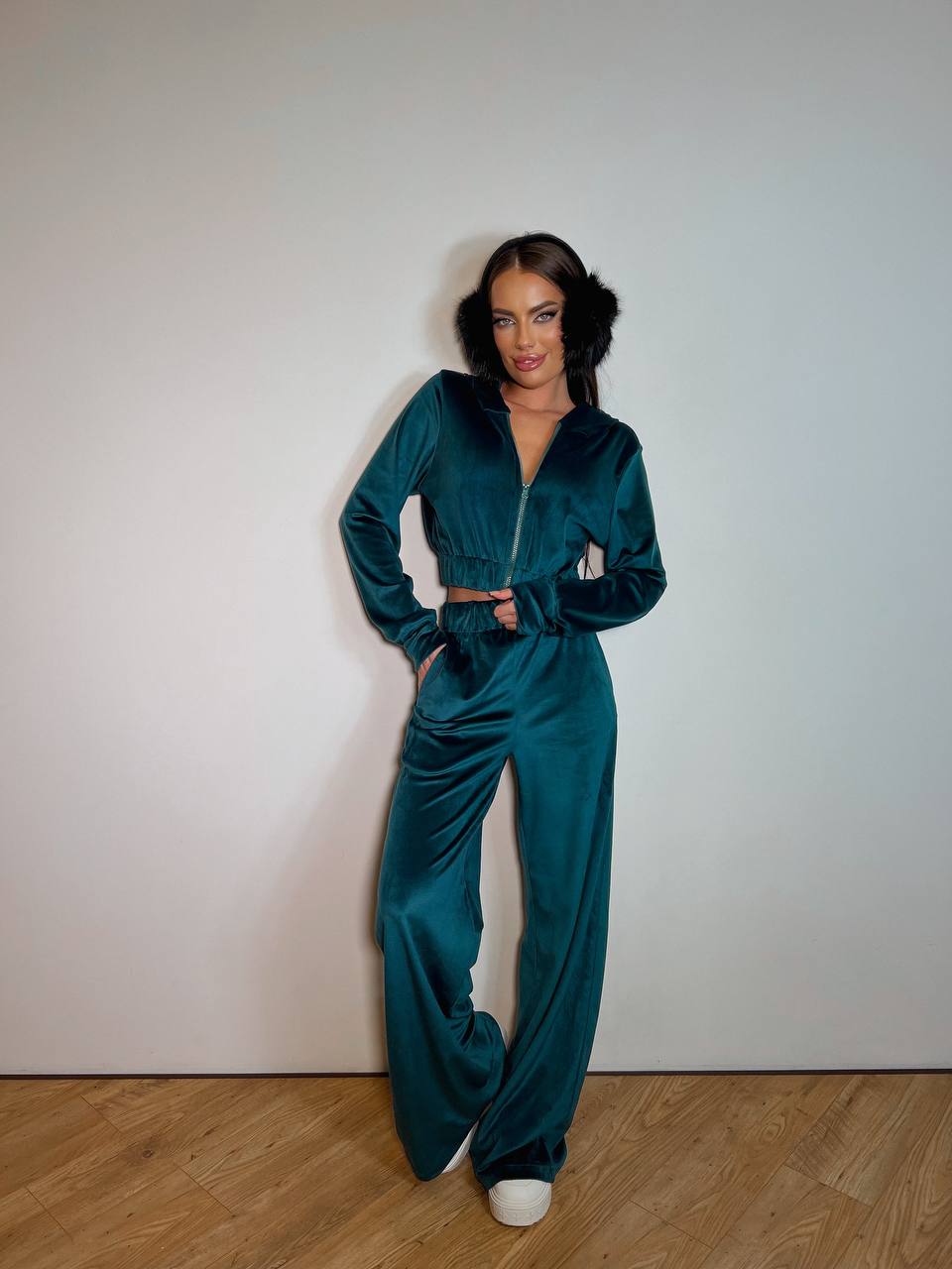 Велюровий жіночий костюм на блискавці смарагдового кольору 31893