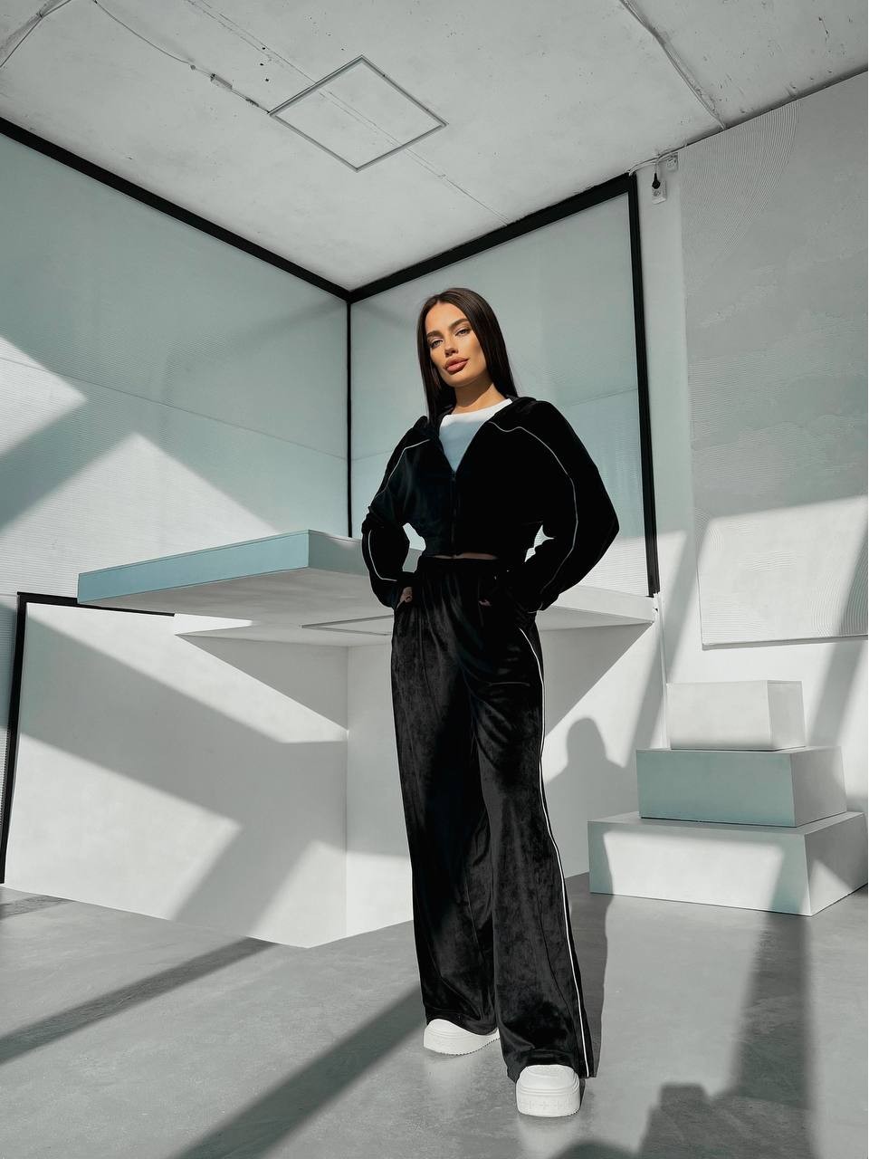 Велюровий жіночий костюм з капюшоном чорного кольору 31709