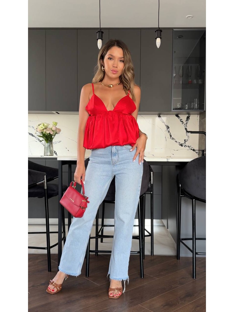 Вечірній жіночий топ з пишним низом червоного кольору 33743