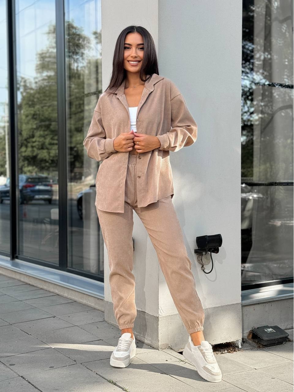 Вельветовий костюм на гудзиках бежевого кольору 34382