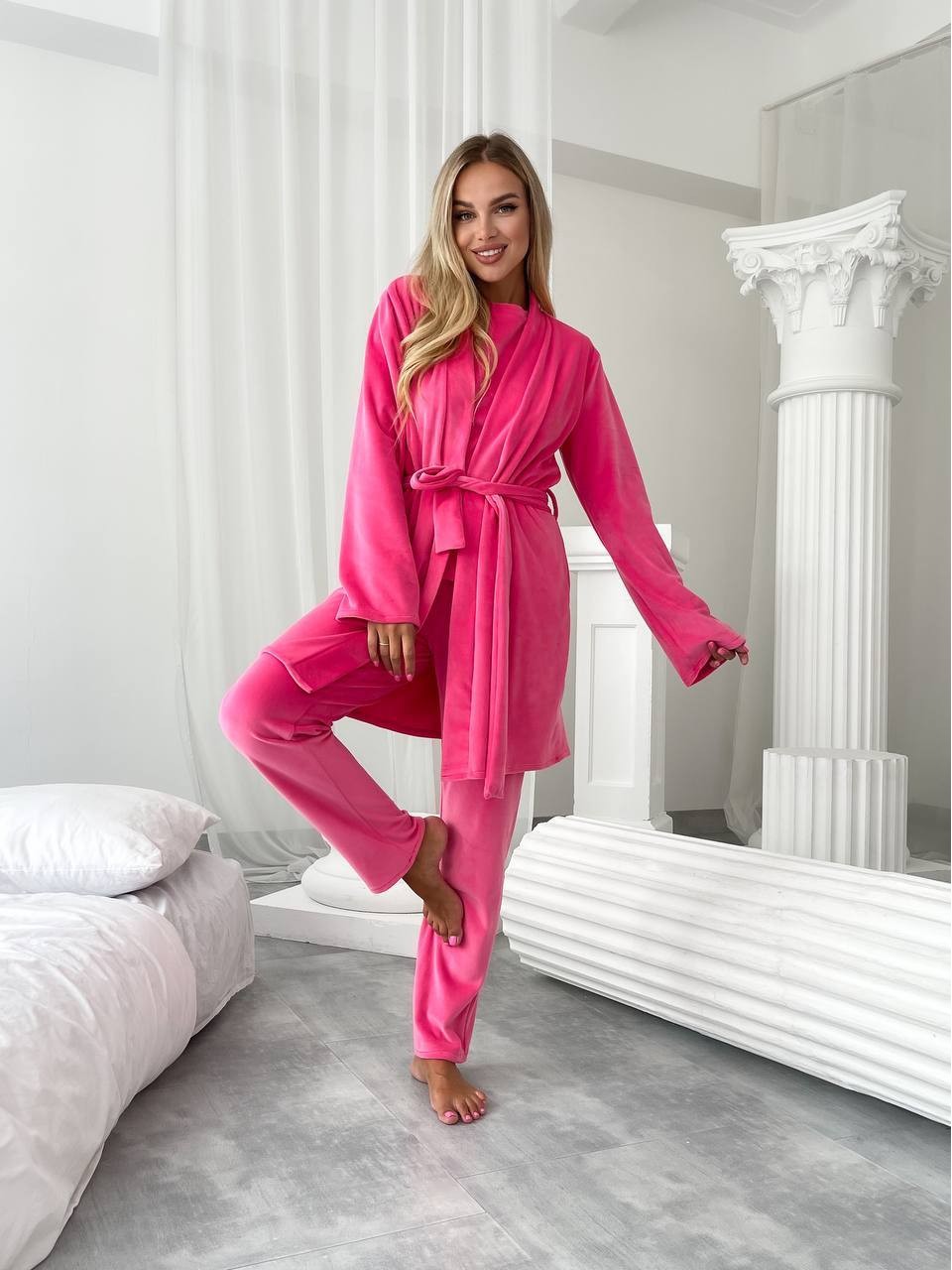 Велюровий домашній комплект трiйка малинового кольору 34541