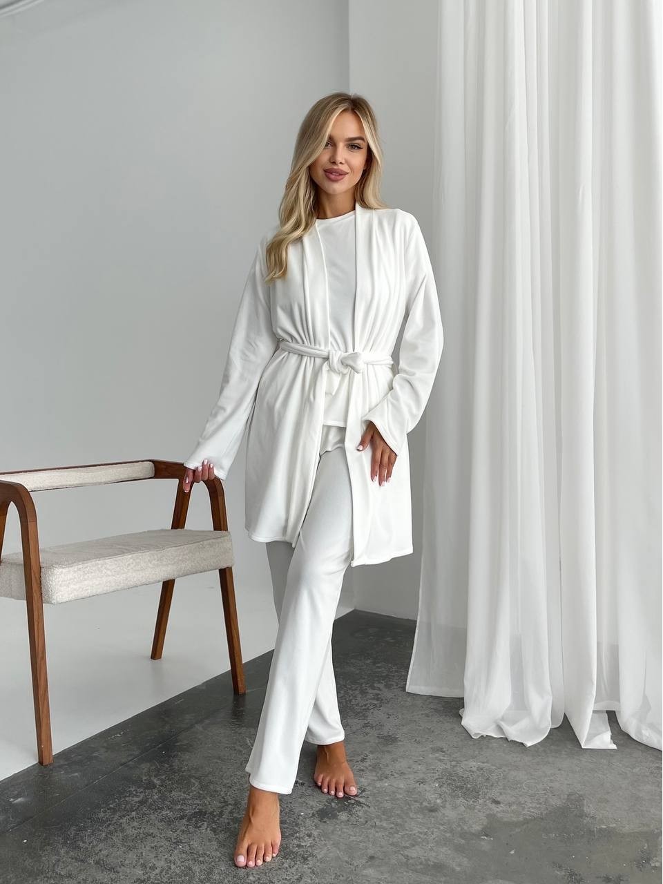 Велюровий домашній комплект трiйка молочного кольору 34537
