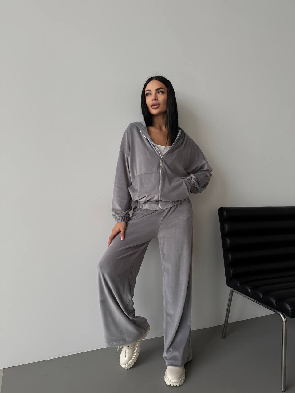 Велюровий жіночий костюм з капюшоном сiрого кольору 34211