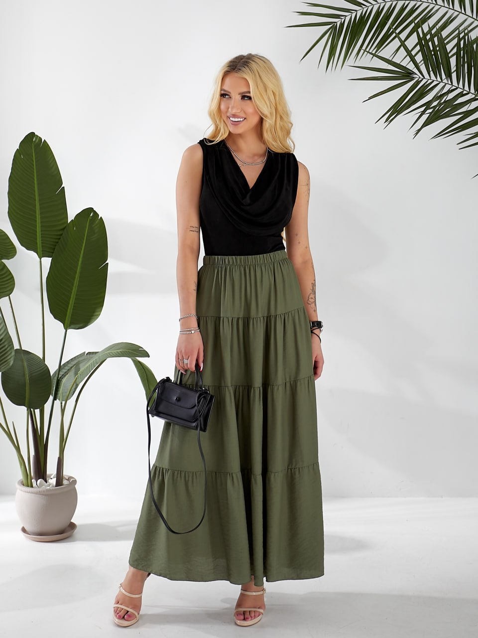 Жіноча льняна спідниця міді з воланами кольору хакi 33214