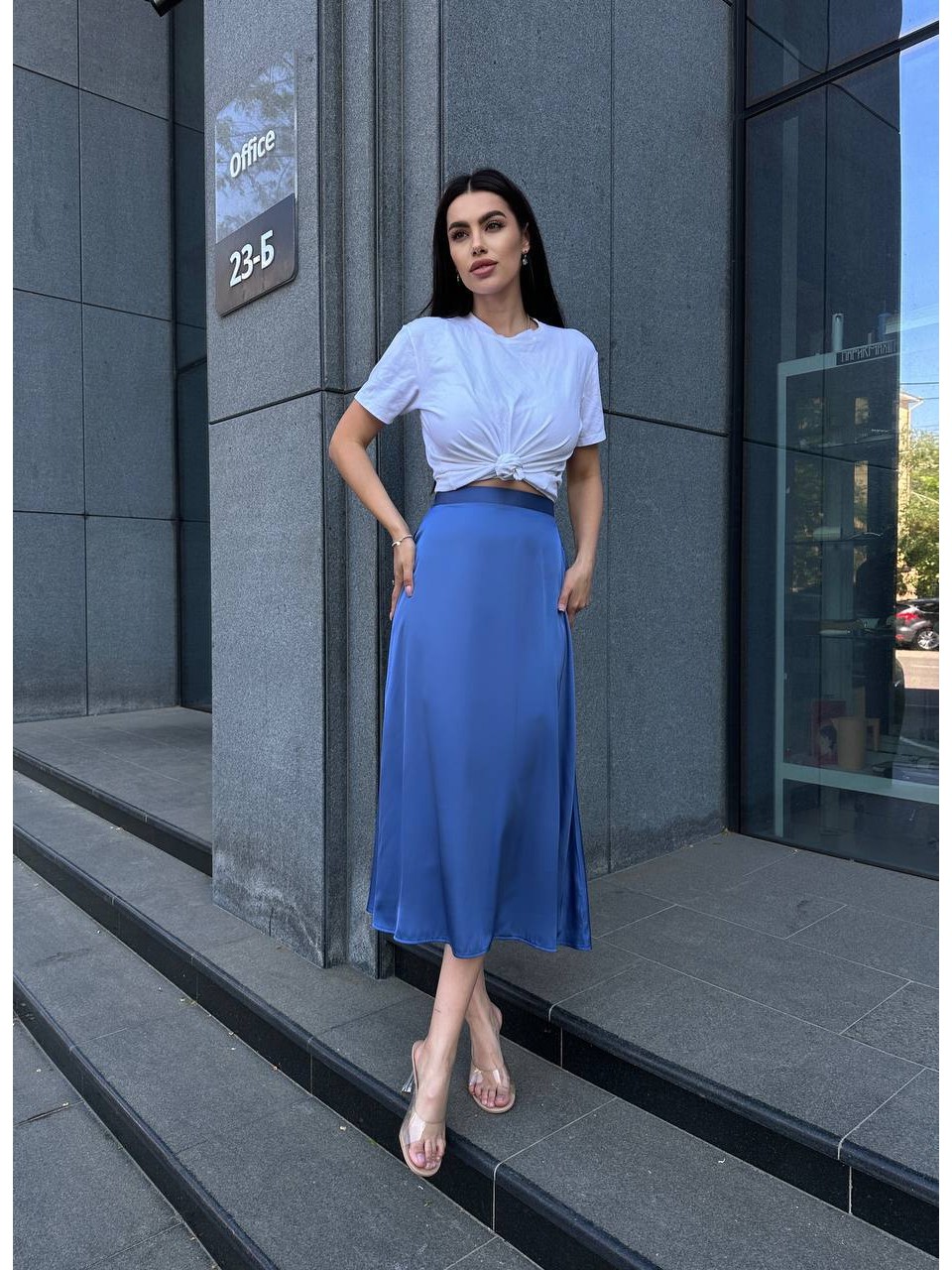 Жіноча шовкова спідниця міді синього кольору 33190