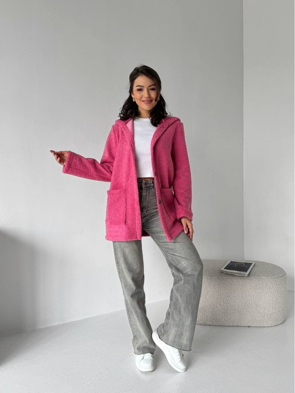 Жіночий кардиган iз букле з капюшоном малинового кольору 31657