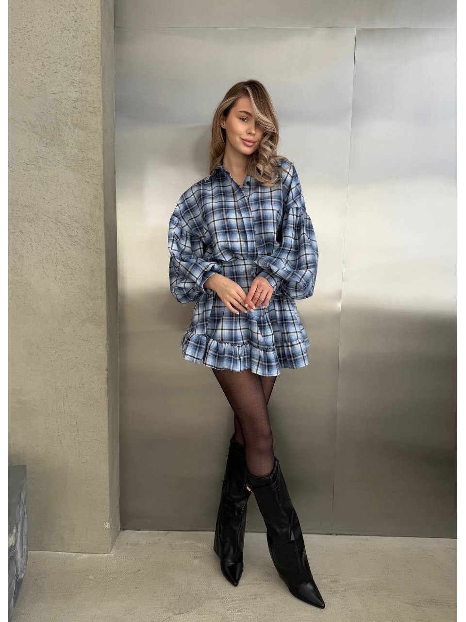 Жіночий комплект спідниця+сорочка в клітку синього кольору 31003