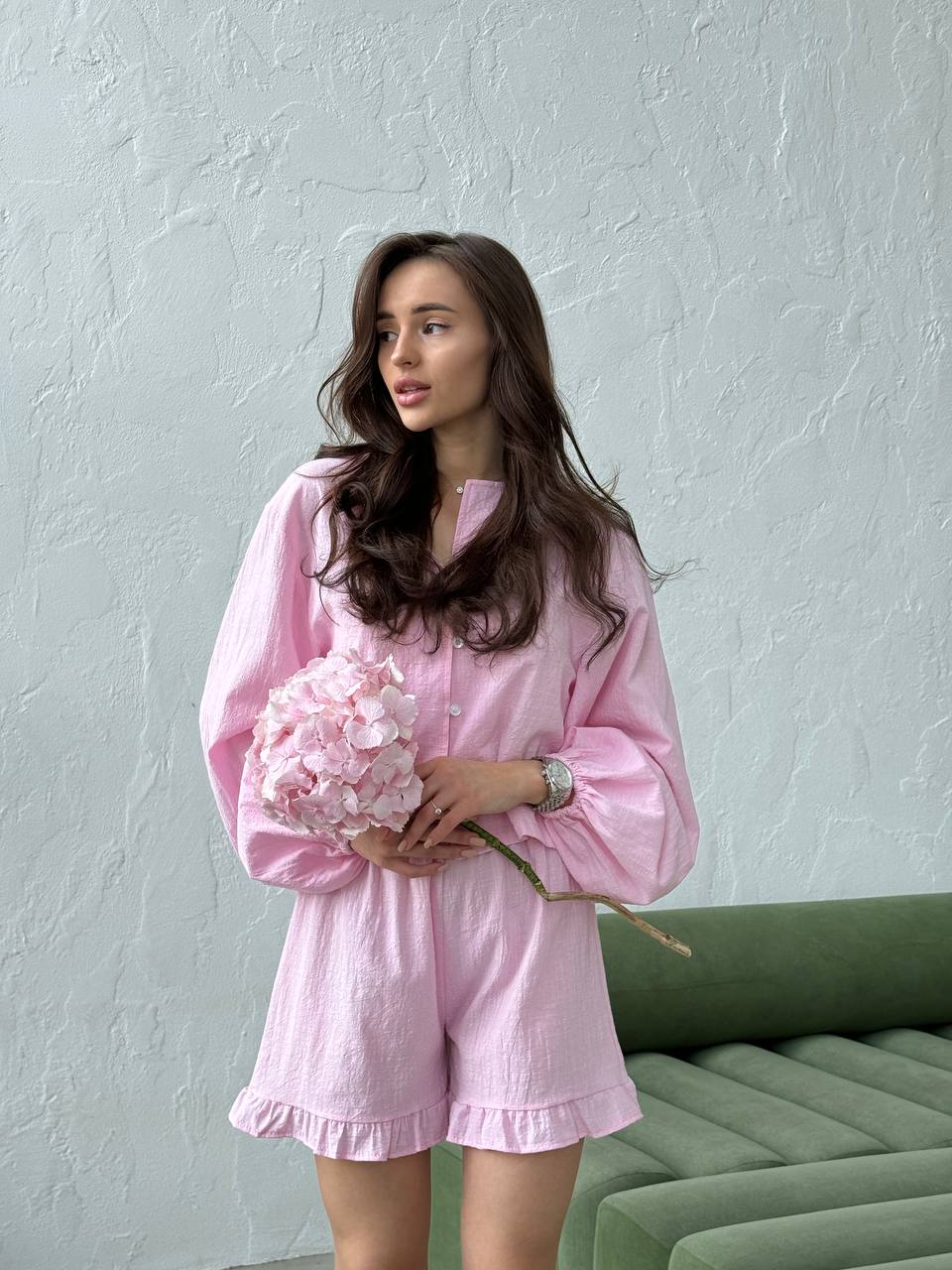 Жіночий льняний костюм з шортами рожевого кольору 33473