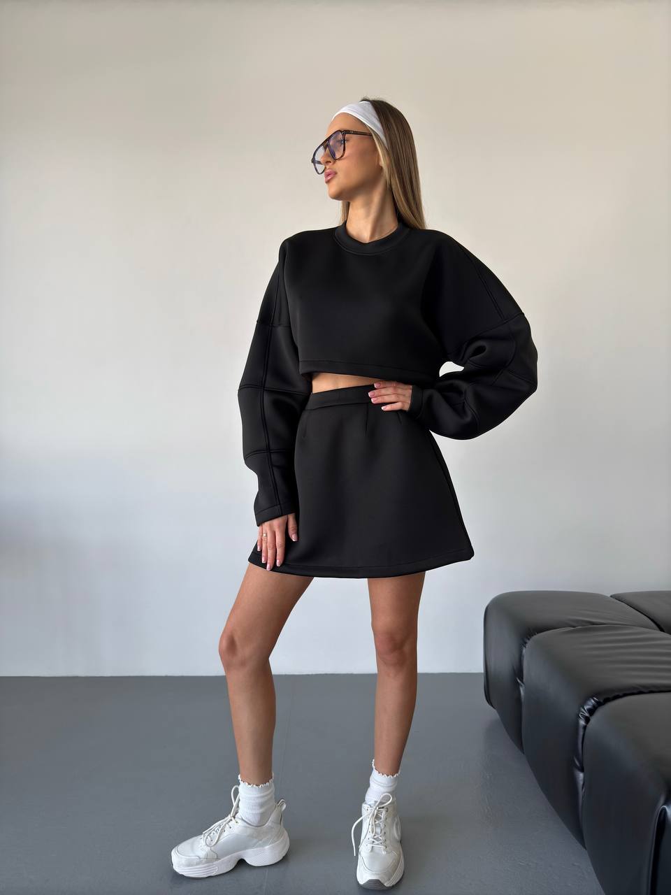 Жіночий прогулянковий костюм спідниця+батник чорного кольору 31425