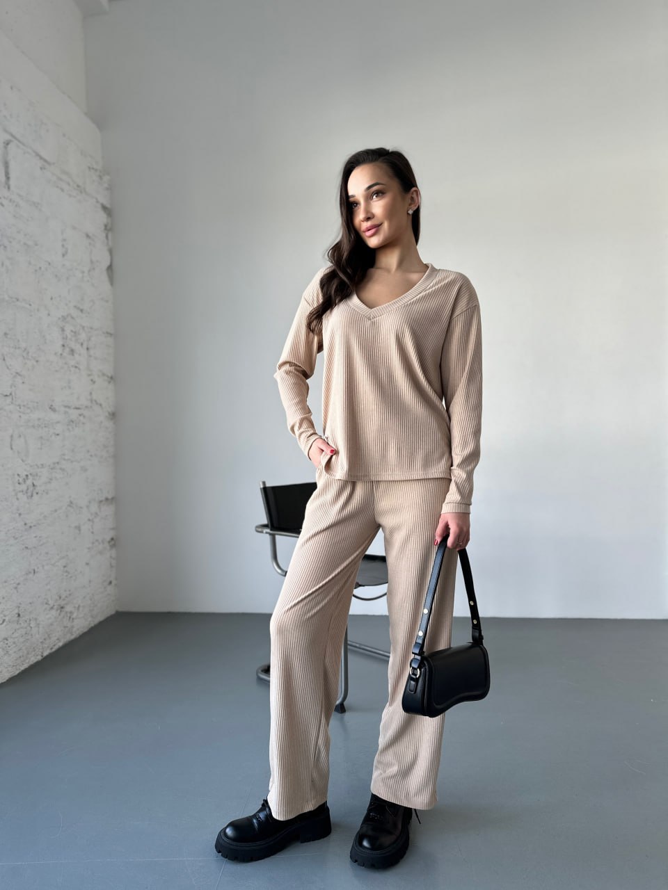 Жіночий прогулянковий костюм з трикотажу в рубчик бежевого кольору 31196