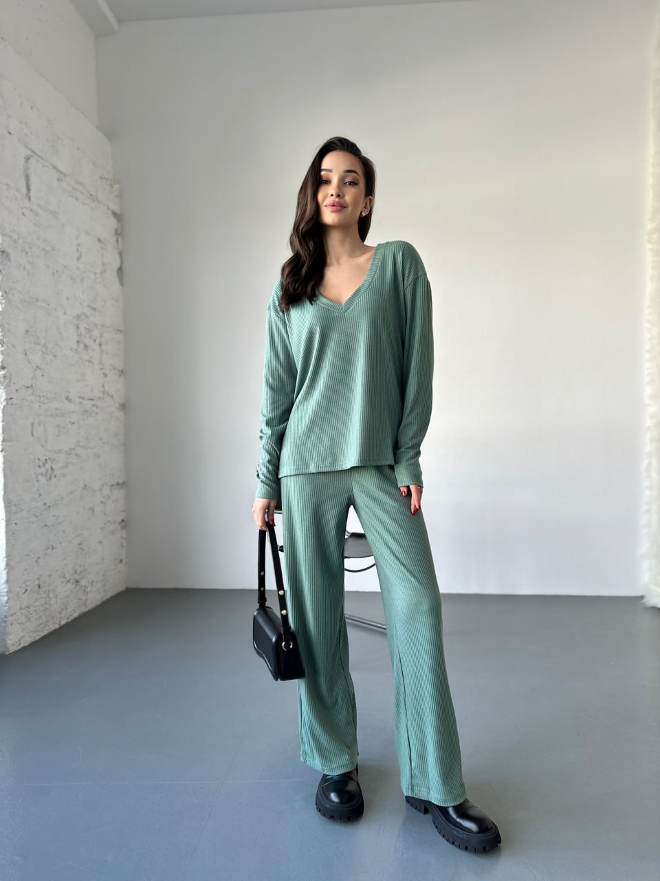 Жіночий прогулянковий костюм з трикотажу в рубчик фiсташкового кольору 31199