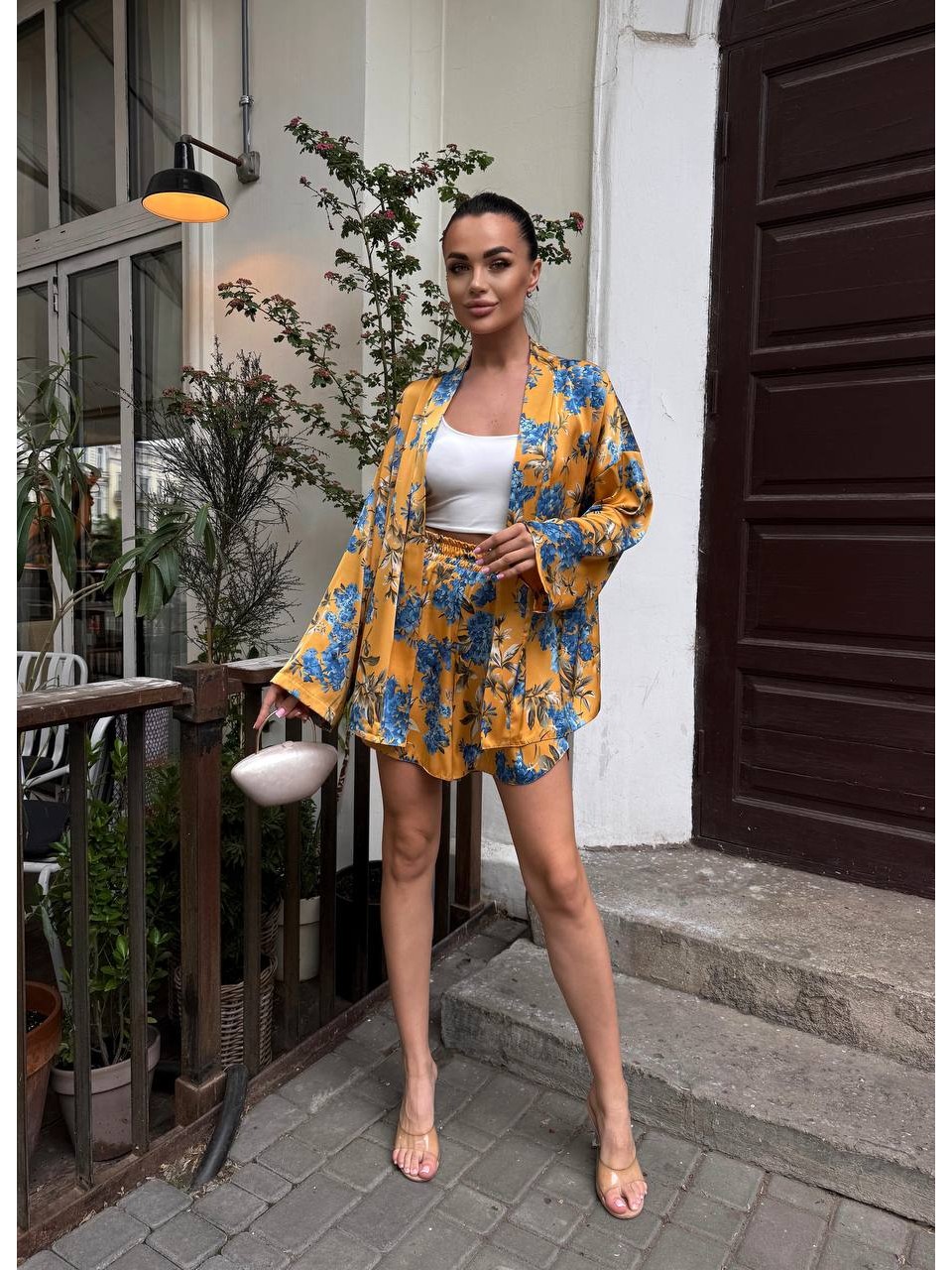 Жіночий шовковий костюм з кімоно жовтого кольору 33480