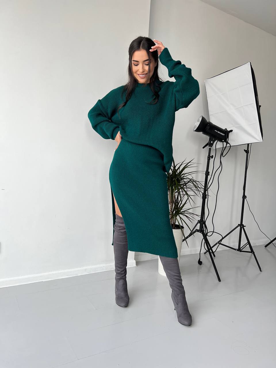 Жіночий теплий костюм зі спідницею смарагдового кольору 30418