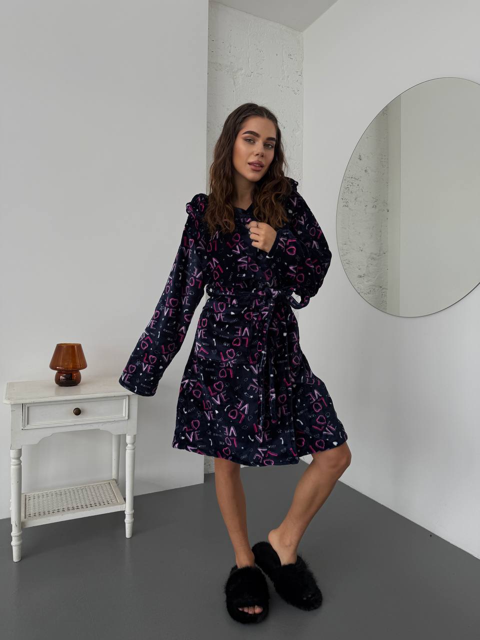 Жіночий махровий халат з написом синього кольору 30345