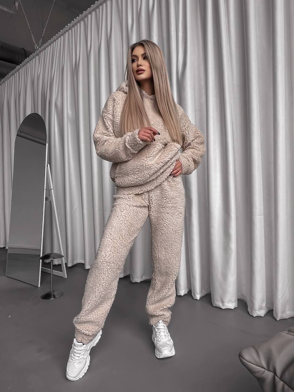 Жіночий теплий костюм з хутра Тедді молочного кольору 30299