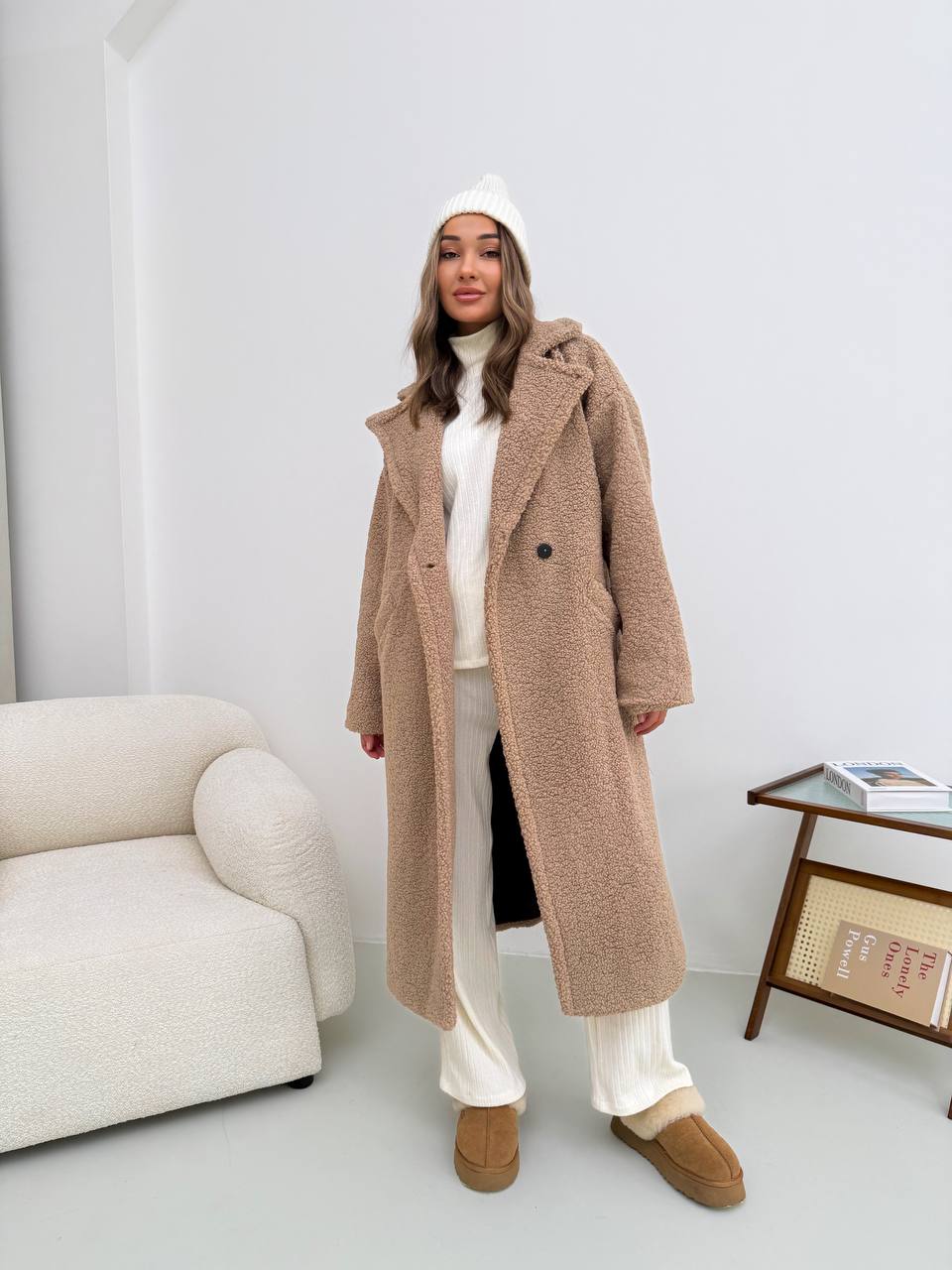 Жіноче тепле пальто з хутра Тедді бежевого кольору 30110